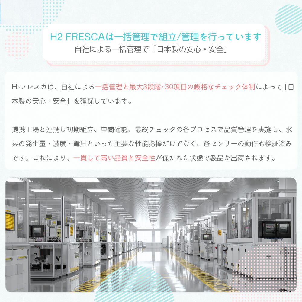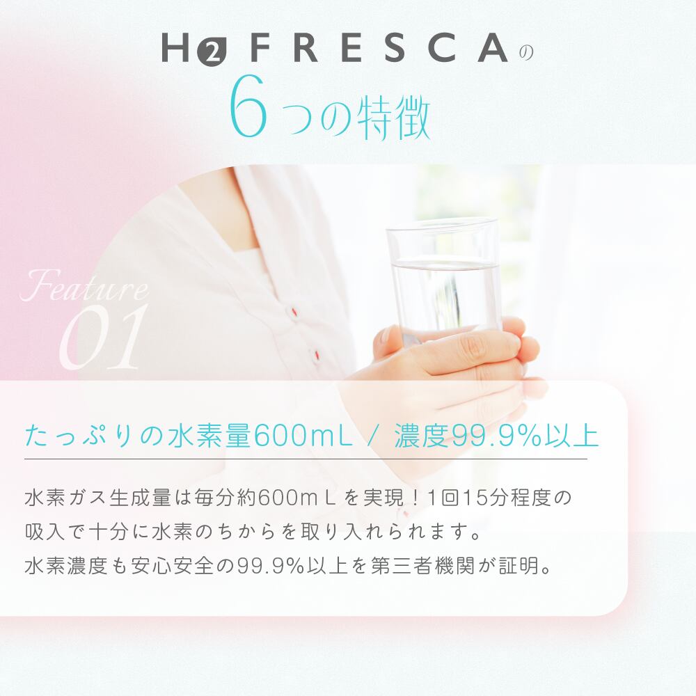 フレスカPROは、毎分約600mlの水素ガスと300mlの酸素を同時生成できる水素吸入器です。クラス最大級のハイスペックモデルで、ご家庭・共有スペースともに贅沢な吸入環境を実現します。