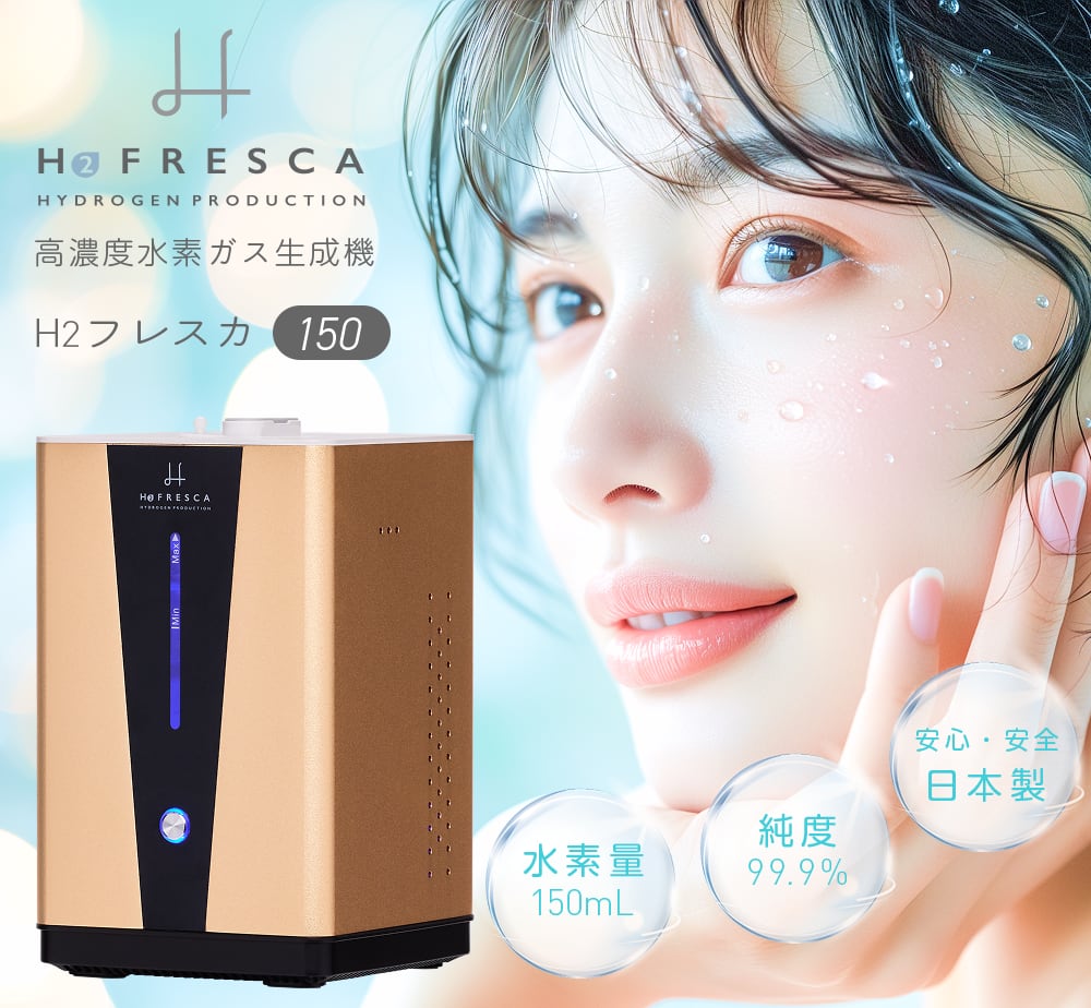 フレスカ150は、毎分約150mlの水素ガスを生成できる水素吸入器です。コンパクト設計のため、ご自宅やオフィスなど、限られたスペースでも設置しやすく、日本製・1年保証付きの安心の一品です。